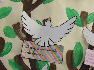 Depois da construção de uma gigantesca Árvore carregada de pombas brancas com mensagens dos alunos, todos puderam assistir à construção da Paz por duas distintas especialistas...